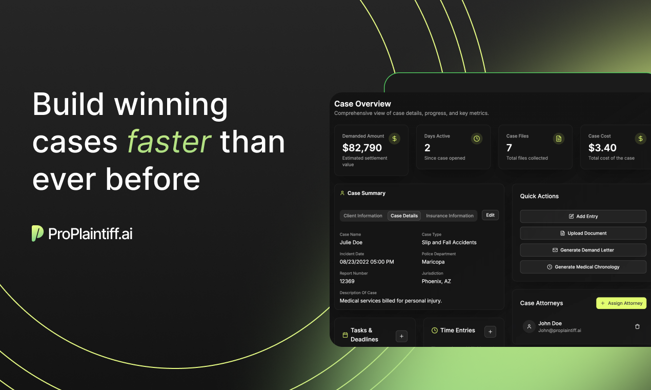 With 6.7 million cases now powering every ProPlaintiff.ai workspace, personal injury firms gain a competitive advantage: an AI paralegal that thinks like a litigator, researches like a legal scholar, and delivers like a seasoned professional—available 24/7, across every active case in your pipeline.